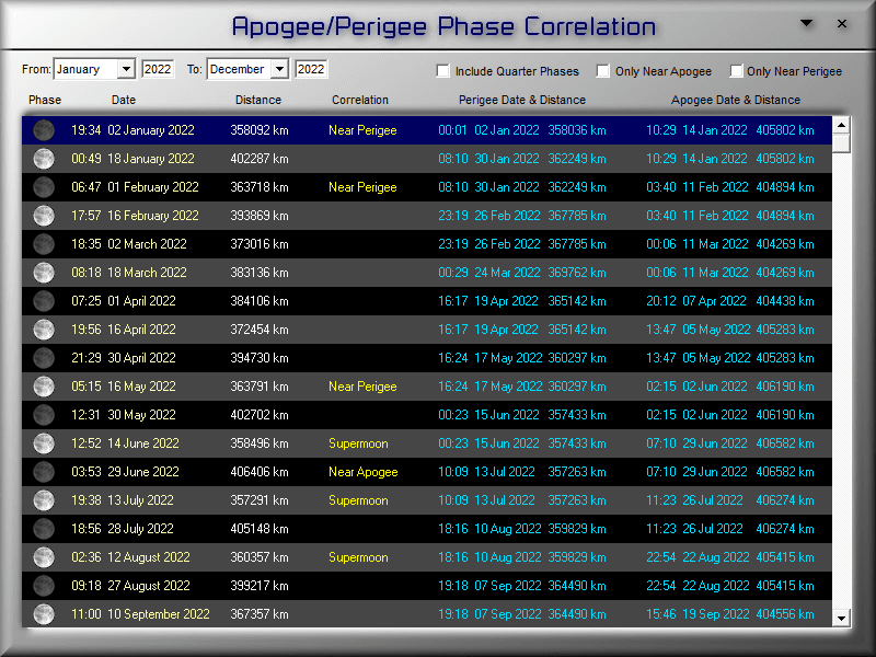 This screenshot from my LunarPhase Pro software shows the New and Full Moons (some of which were Supermoons) up until September this year: